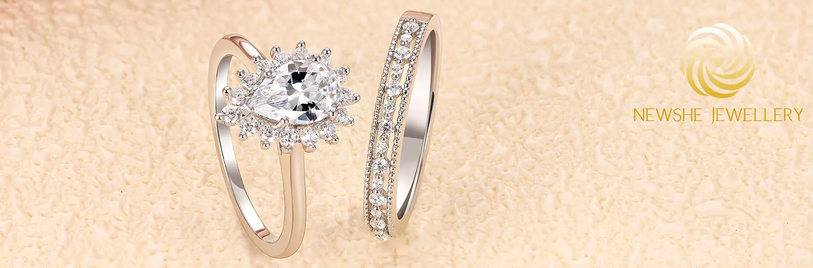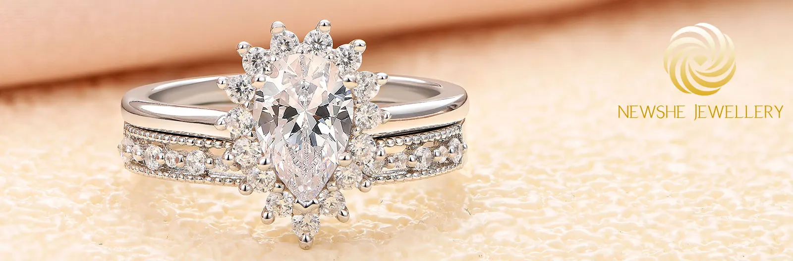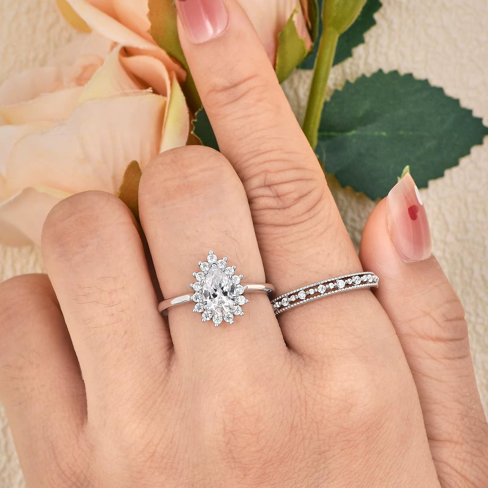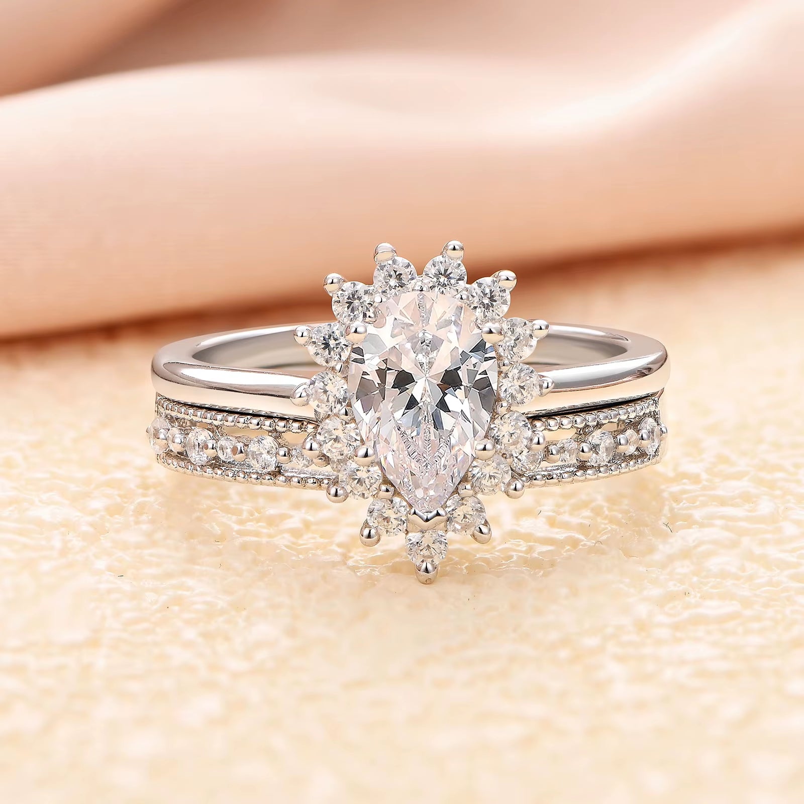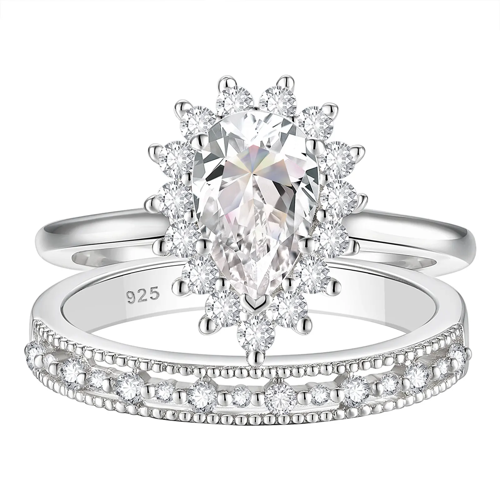 Anillo de compromiso de plata 925 con halo corte pera y alianza de eternidad para mujer con circonia cúbica