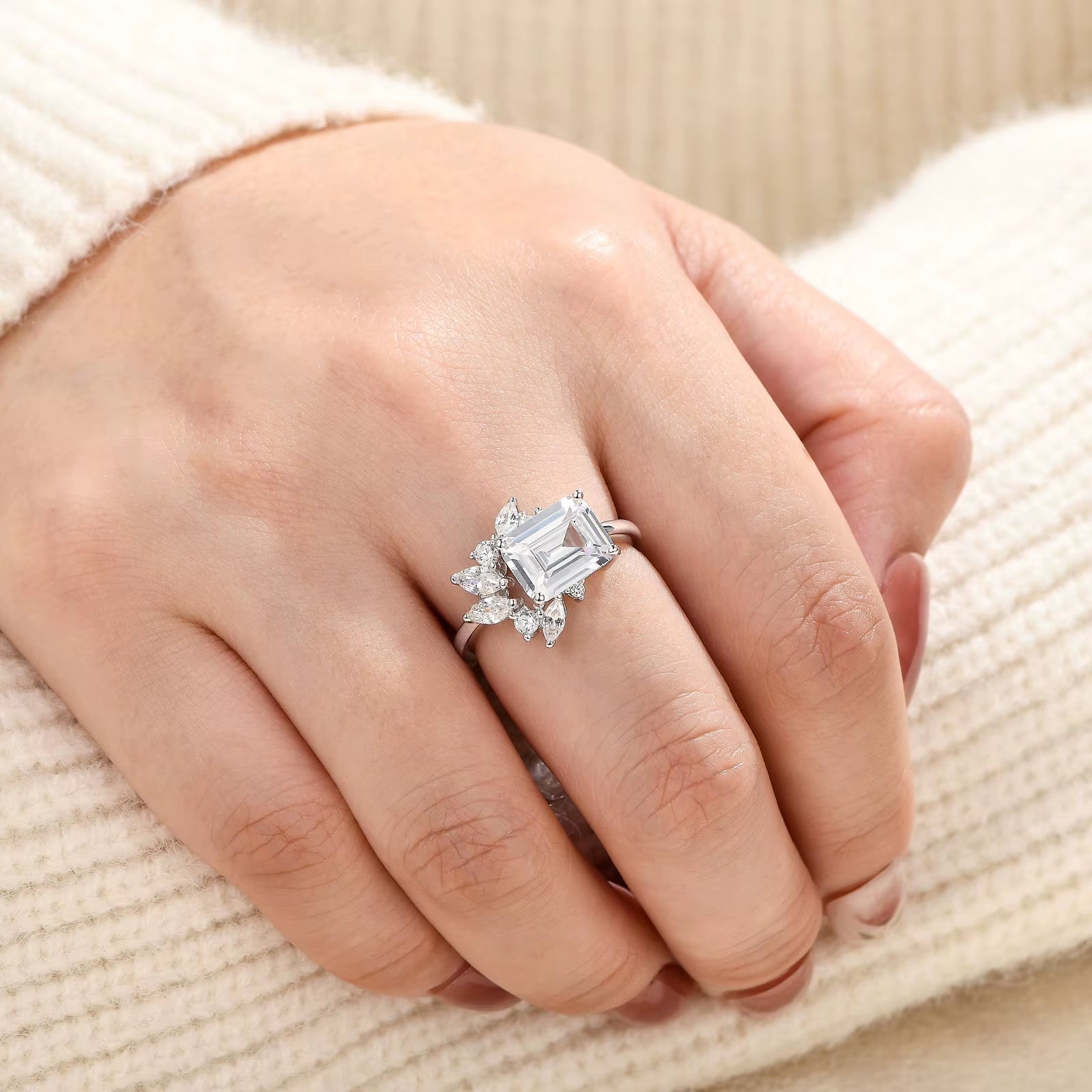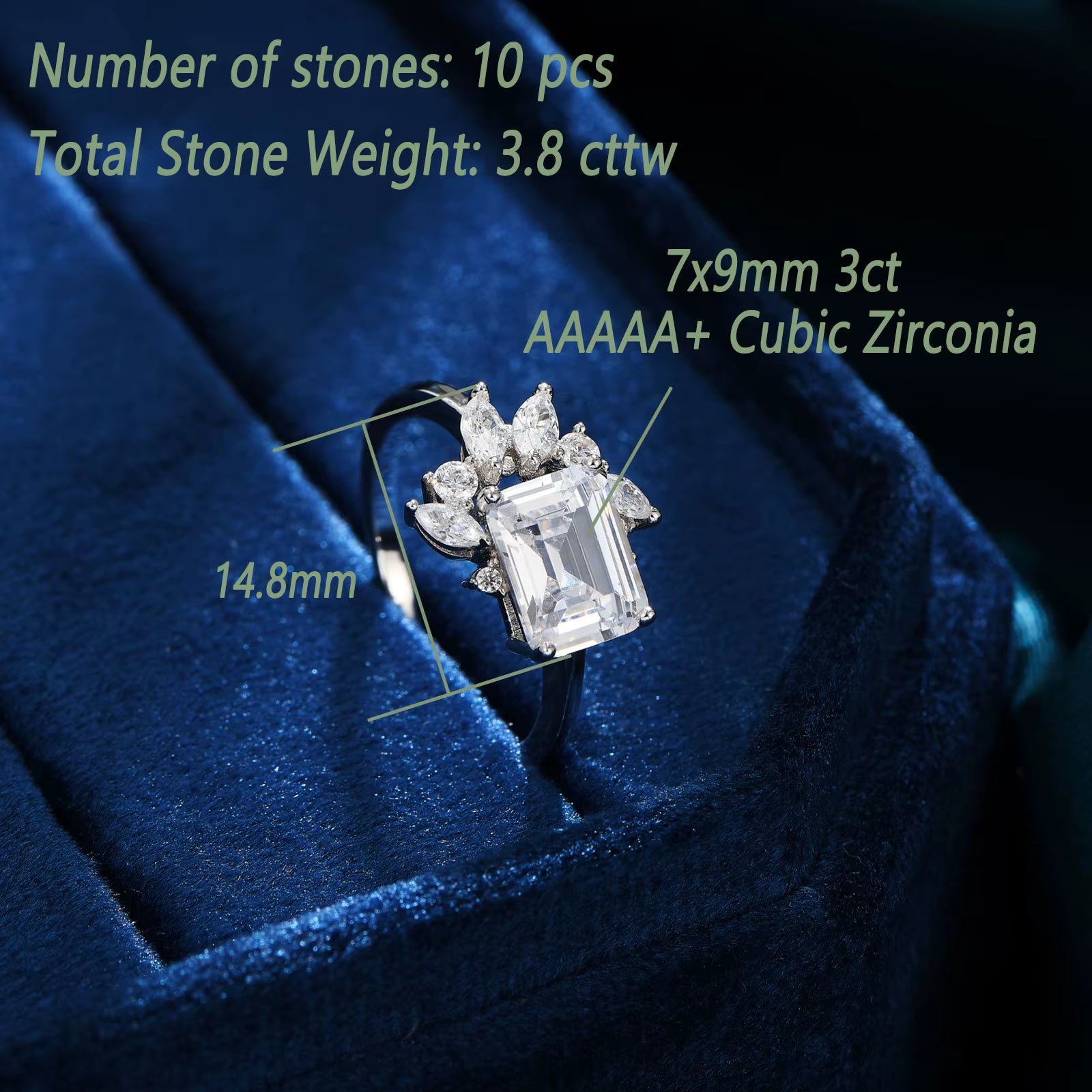 Este anillo solitario de plata 925 destaca por su piedra en corte esmeralda colocada en un distintivo diseño este a oeste, ofreciendo una estética moderna y sofisticada perfecta para bodas y compromisos. La circonia cúbica aporta un brillo limpio y elegante, realzando el estilo minimalista de la pieza. Con un acabado de alta calidad y una presencia refinada, este anillo es una opción ideal para quienes buscan una joya única, duradera y llena de significado. _______________________________________________ Características: Metal: Plata de ley 925 maciza Tipo de gema: Circonita cúbica AAAAA Tamaño de la piedra principal: 7 x 9 mm, talla esmeralda, 3,0 ct Talla EE. UU.: Talla 5 a 10 Peso total: 2,48 g Contenido del paquete: 1 anillo, bolsa de polipropileno, estuche de joyería