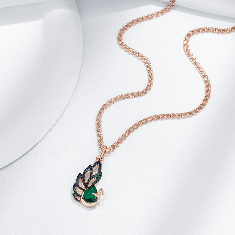 Este collar con colgante de pavo real presenta un estilo vintage único, elaborado en chapado de oro rosa 585 y detalles en negro que realzan su diseño artístico. Su circonita azul natural aporta un brillo profundo y llamativo, convirtiéndolo en una pieza sofisticada ideal para uso diario o para complementar looks especiales. Con un acabado fino y materiales de alta calidad, este collar destaca por su belleza, durabilidad y personalidad, siendo una opción perfecta para regalar o añadir un toque distintivo a tu estilo.