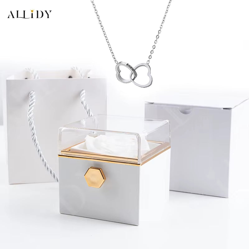 Este collar de acero personalizado con nombre en doble corazón es un regalo creativo y significativo para mujer, combinando elegancia y toque personal. Cada colgante de corazón puede ser grabado con el nombre o palabras que elijas, colgando de una cadena de acero inoxidable duradera y brillante. Presentado en una encantadora caja rosa eterna, el set ofrece un empaque romántico y sofisticado, ideal para San Valentín, aniversarios, cumpleaños o cualquier ocasión especial. Este collar no solo destaca por su diseño delicado y moderno, sino también por su resistencia al deslustre, convirtiéndolo en un obsequio memorable que celebra el amor y la individualidad.