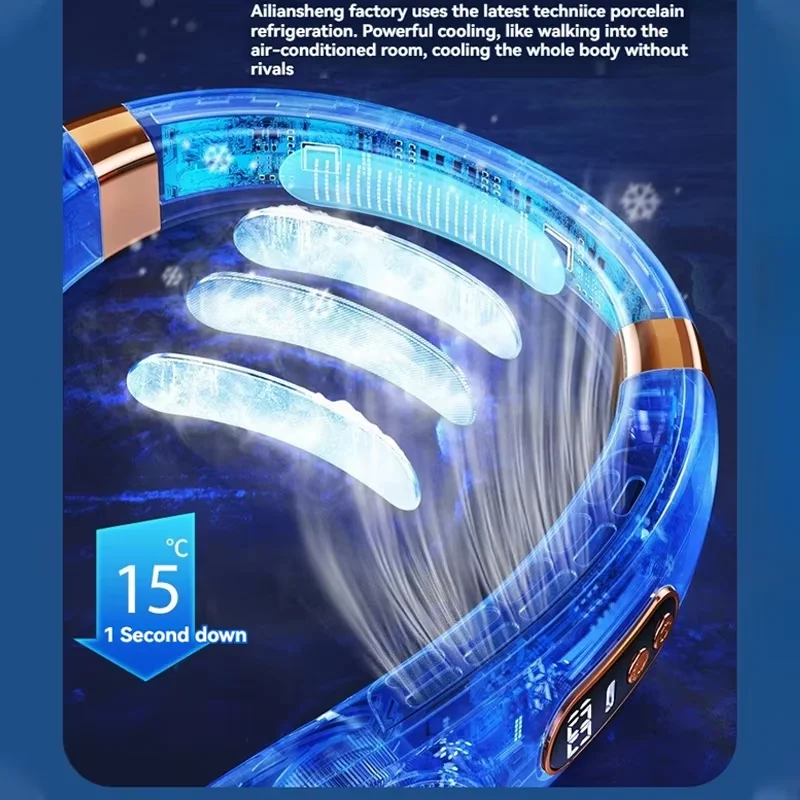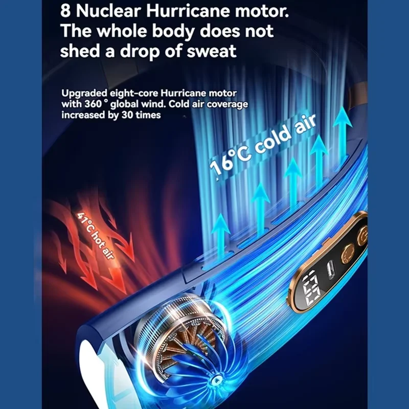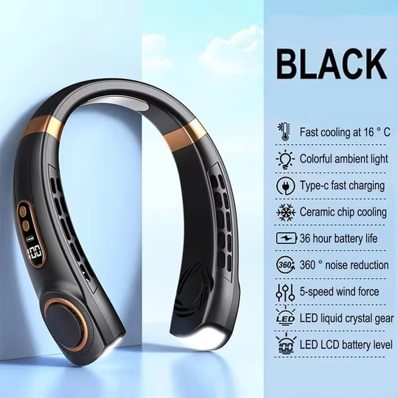 Este ventilador de cuello sin aspas combina diseño elegante estilo auricular con funcionalidad avanzada, ofreciendo un flujo de aire silencioso y cómodo para actividades al aire libre, trabajo, lectura o relajación en casa. Compacto, liviano y portátil, es ideal para viajar, hacer caminatas, acampar, ir al gimnasio o disfrutar de festivales, con 5 velocidades ajustables, pantalla digital de nivel de batería, carga rápida tipo C e iluminación ambiental moderna. Fabricado en material ABS duradero con sensación de porcelana helada y disponible en colores sofisticados como negro o azul intenso, este ventilador de cuello manos libres garantiza comodidad, frescura y estilo en cualquier momento y lugar.