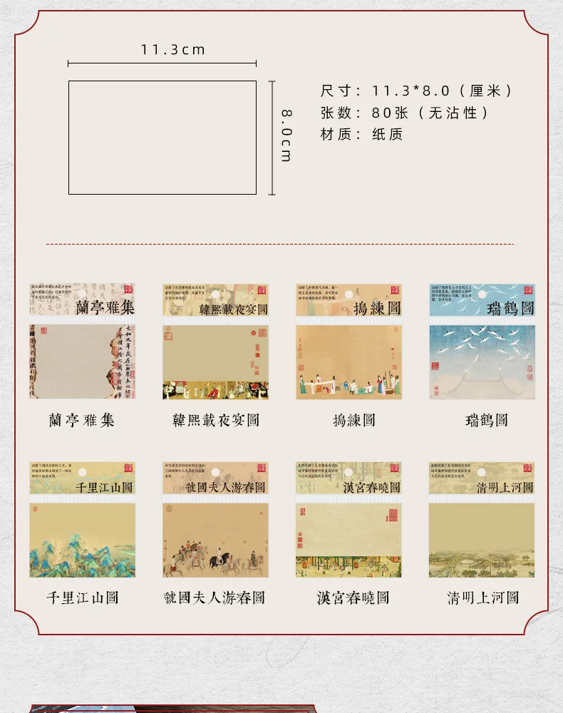 Este caderno de 80 folhas com design inspirado em pinturas da China antiga combina elegância tradicional com praticidade moderna, ideal para o escritório, escola ou uso diário. Suas páginas lisas proporcionam uma escrita confortável e nítida, enquanto a capa decorativa, inspirada na arte clássica chinesa, adiciona um toque distinto e refinado. Perfeito para anotações, organização de ideias, planejamento de tarefas ou para presentear amantes de artigos de papelaria com foco em estética e cultura.